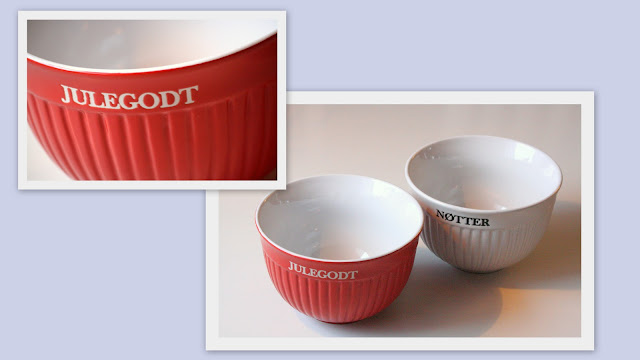 Jeg prøvde tappert å legge inn et blogginnlegg i går, men jeg måtte gi opp.. Heldigvis funket det i dag :) Med nytt hus og "tomme" skap, så trengs det litt påfyll. Spesielt siden vi ikke har pyntet så mye til jul før, vi har ikke så veldig mye julepynt. Dessuten så er det veldig stas å kjøpe inn litt nytt til sitt eget hus, vi skal skape vår egen jul i år :) Før helga var det to søte skåler som ble med meg hjem fra Europris. Nøtter og julegodt, greit for både oss og eventuelle gjester at skålene selv forteller hva de inneholder. Hehe..
